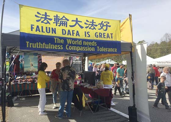 法轮功学员们向参加大桥节的民众介绍了法轮功在中国大陆受到严重迫害的情况,以及中共活摘法轮功学员器官的暴行。