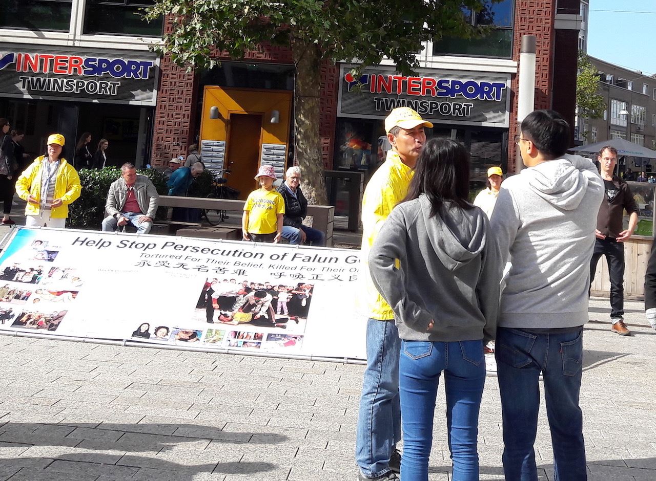 准备把海外法轮功学员们炼功的场面带回国的大陆游客,边拍摄边接过资料对学员说:“没想到在马斯特里赫特也能看到你们,我在科隆也遇见过你们,我在那里也接过资料。”