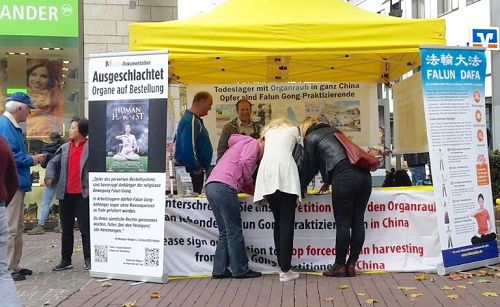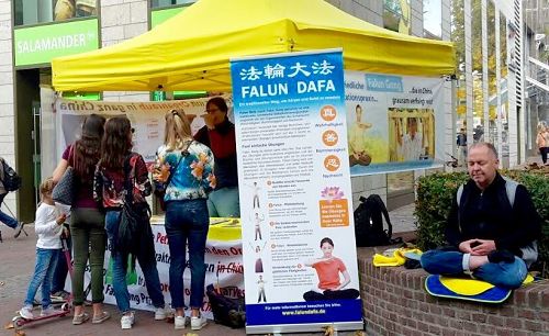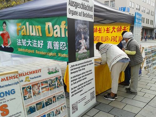 二零一七年十月二十一日,巴伐利亚州的奥格斯堡法轮功学员举办了活动,他们在市内国王广场(königsplatz)摆出展位,吸引了过路民众观看,不少人看完展板之后马上签名制止中共迫害法轮功。