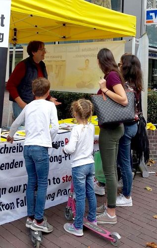 当天的天气可以用“金色十月”来形容,一整天市内行人如织,老远人们就可以看到黄色的横幅《法轮大法》,当人们听到法轮功学员宣读的真相之后,不少人前往展台,询问有关法轮功的真相,当他们了解到法轮功在中国被中共如此严重的迫害,纷纷签名制止中共的迫害,签名的人如此之多,有时不得不排队等候。
