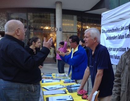 有位德国老人,了解到在中国发生的活体摘取法轮功学员器官的事是国家机构有组织的行为,感到很震惊,他在给联合国人权委员会的签名簿上签名,制止中共活摘法轮功学员器官的罪行,同时索要了不少资料。另外他也对法轮功的功法很感兴趣,并打听在什么地方可以学炼法轮功。