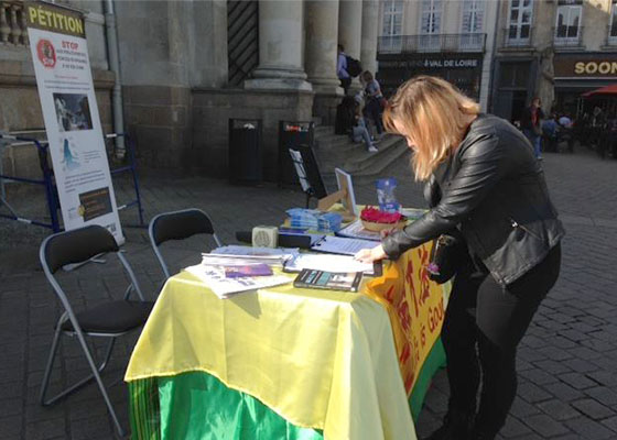 居住在法国南特市的法轮功学员架起了信息台,告诉市民,什么是法轮功和目前发生在中国的罪行:对法轮功的迫害和活体摘取法轮功学员器官的事实。