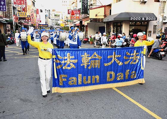 十月二十八日,南台湾冈山妈祖螺艺文化节盛大登场,在法轮大法天国乐团的前导下,欢喜洋洋地展开序幕。迎着壮观的法轮功方阵,民众不约而同夸赞称好。