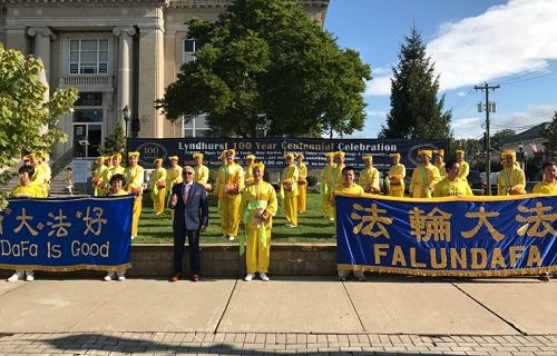 九月三十日,美国新泽西州的林赫斯特市举办一百周年的大庆,法轮功学员的腰鼓队和横幅队为庆典活动送去了真诚的祝福并增添了很多的喜庆。