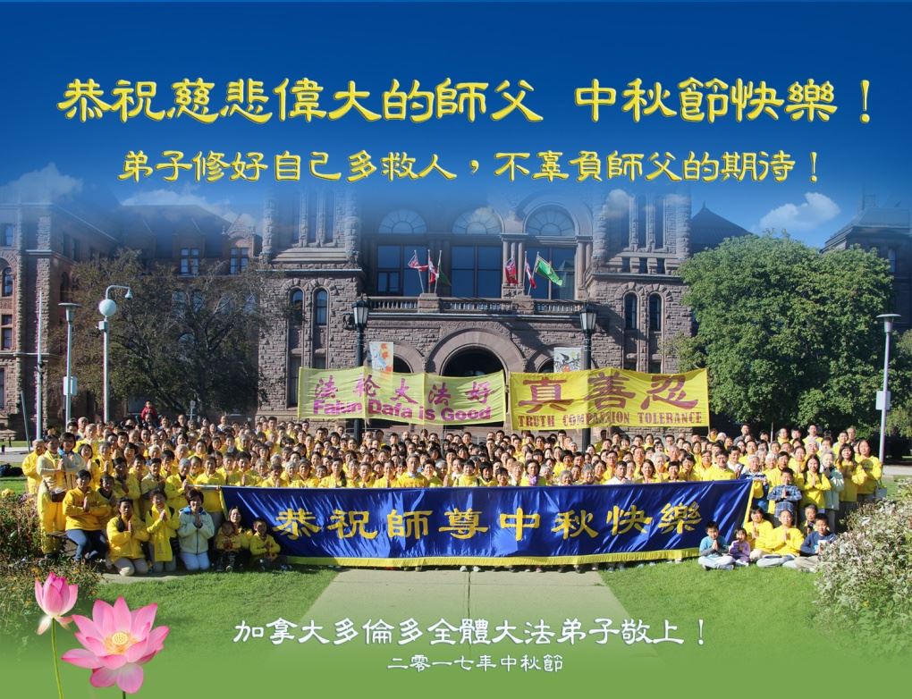 ![]() 图1:加拿大多伦多全体法轮功学员恭祝师父中秋节快乐! |