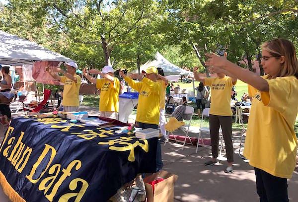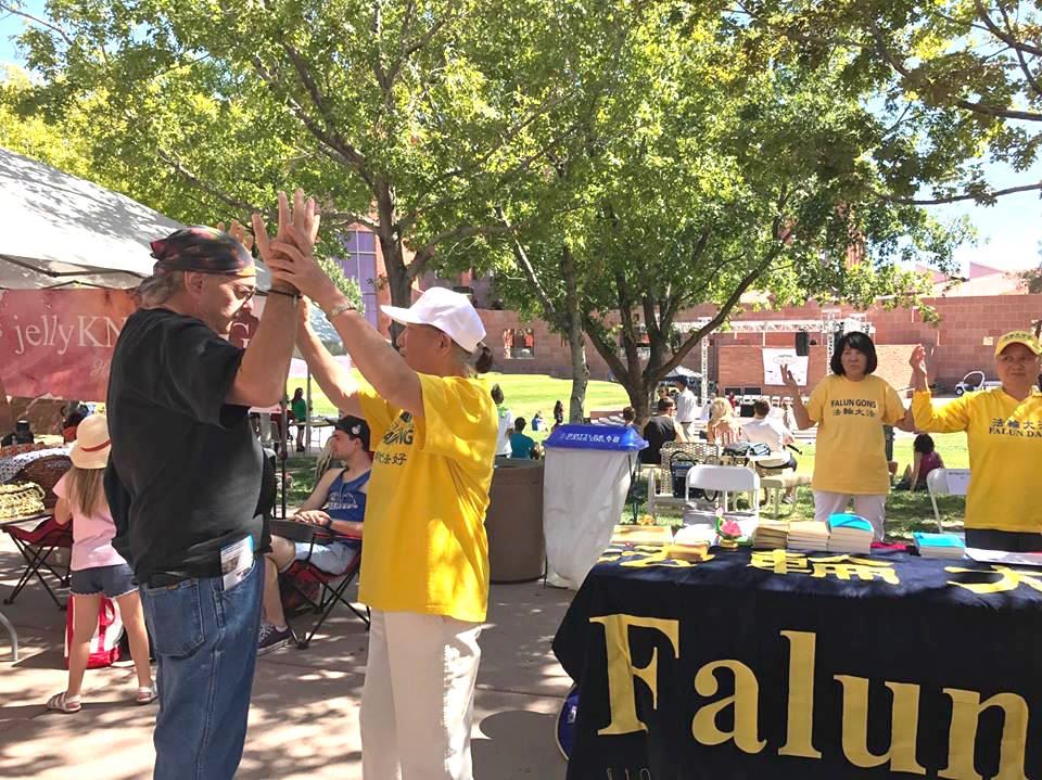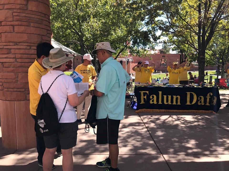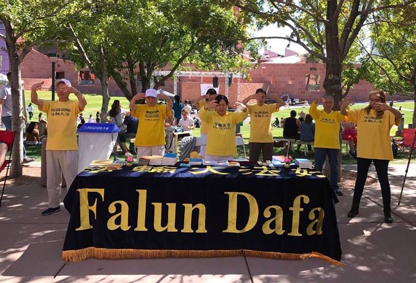 法轮功学员设置的展位上摆放着写有中英文“法轮大法”的醒目横幅,悠扬音乐和平静的功法展示,吸引了众多的克拉克县居民。