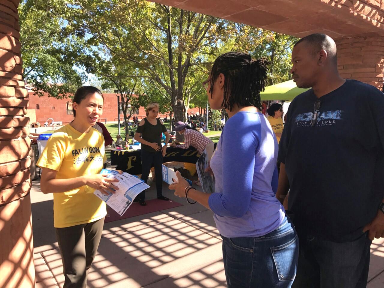 很多人是第一次听到法轮功,在听取了学员介绍后,他们表示非常感兴趣,同时感谢法轮功学员把这些美好的信息带给他们。
