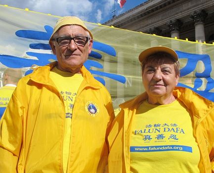 在游行的队伍里,一对老年夫妇手持横幅健步行进,原来他们是来自西班牙的Josefern and ez Lozand先生和夫人,他们于二零零三年同时得法,自此开始了人生的新旅程。