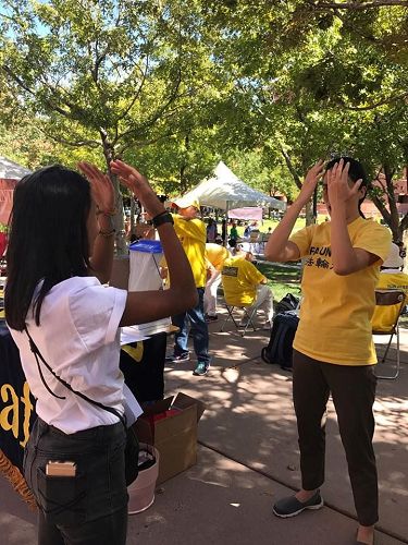 法轮功学员设置的展位上摆放着写有中英文“法轮大法”的醒目横幅,悠扬音乐和平静的功法展示,吸引了众多的克拉克县居民。