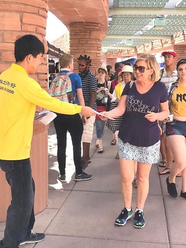 很多人是第一次听到法轮功,在听取了学员介绍后,他们表示非常感兴趣,同时感谢法轮功学员把这些美好的信息带给他们。