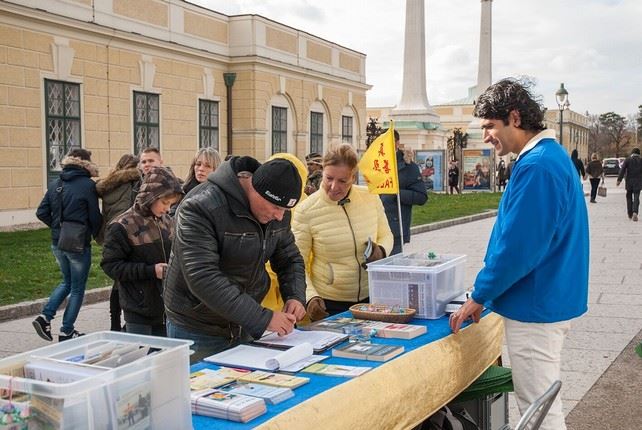 ![]() 图1-2:法轮功学员在维也纳著名景点Schoenbrunn举办信息日活动,征集反迫害签名 |