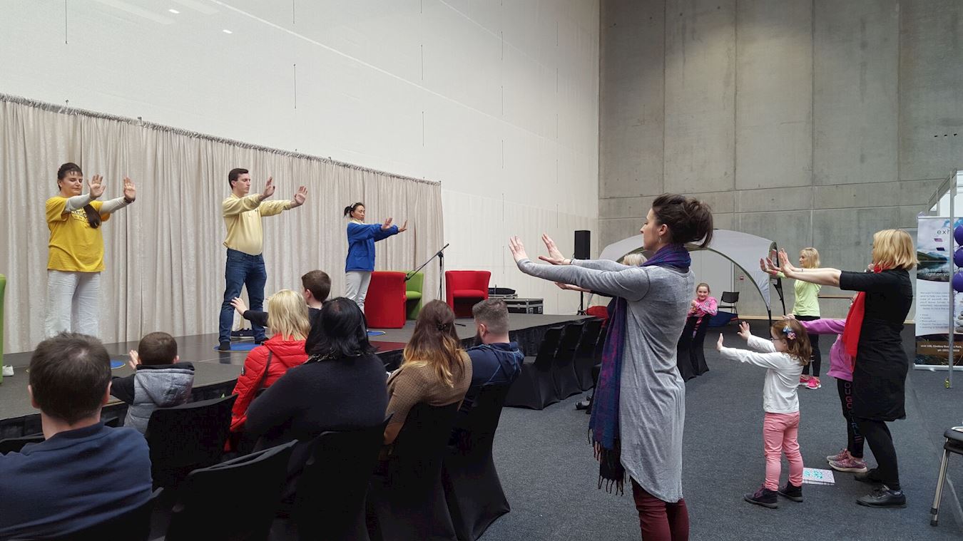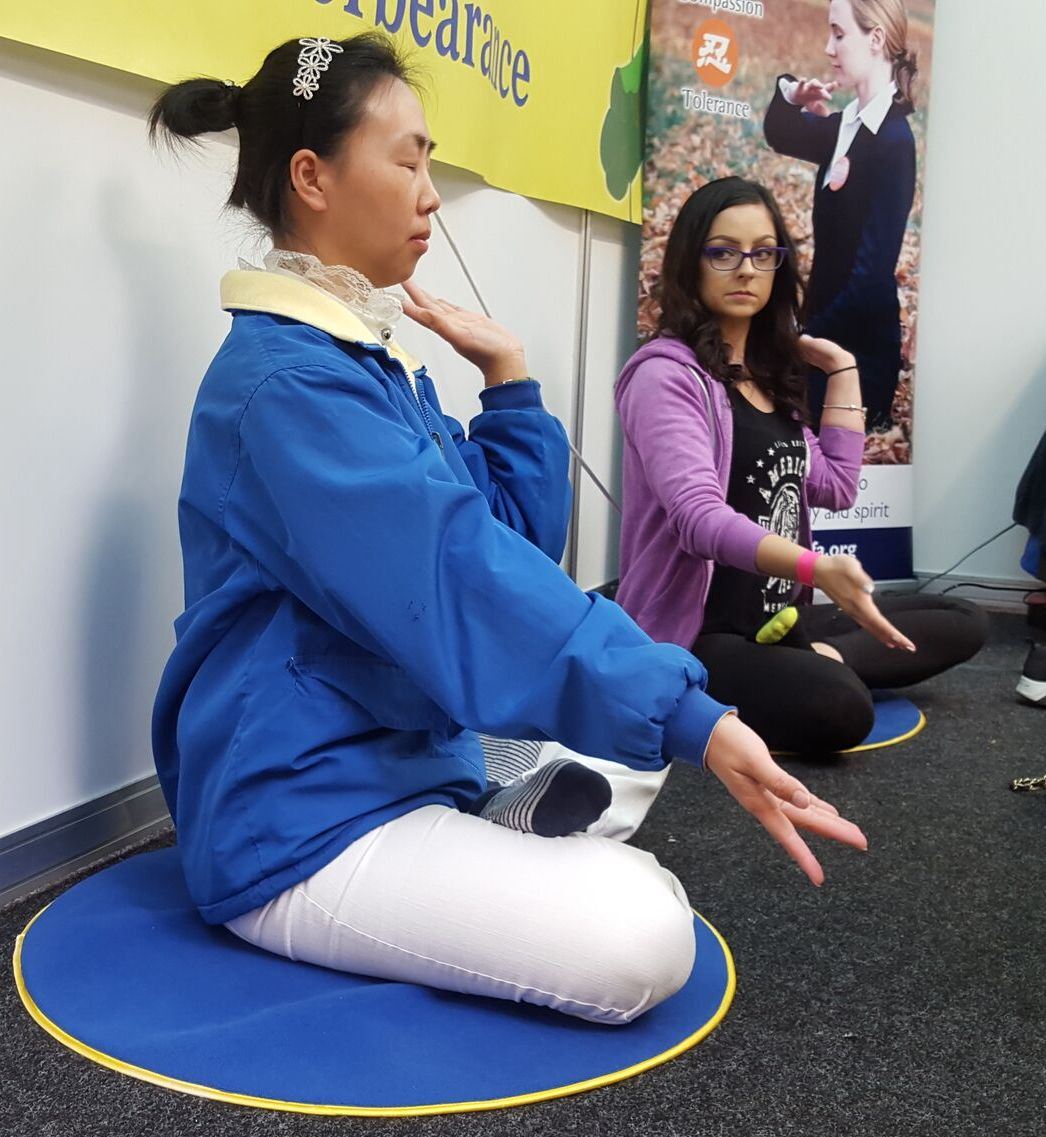 十月二十八日至三十日,展会三天适逢银行假期,许多游客是家人朋友结伴而来。现代社会的压力使很多人想寻求一种既能强身健体又能舒缓精神的方法,法轮功宁静祥和的功法吸引了许多人驻足。不少人在法轮功展位前阅读真相资料,或跟着法轮功学员一起学习功法动作。
