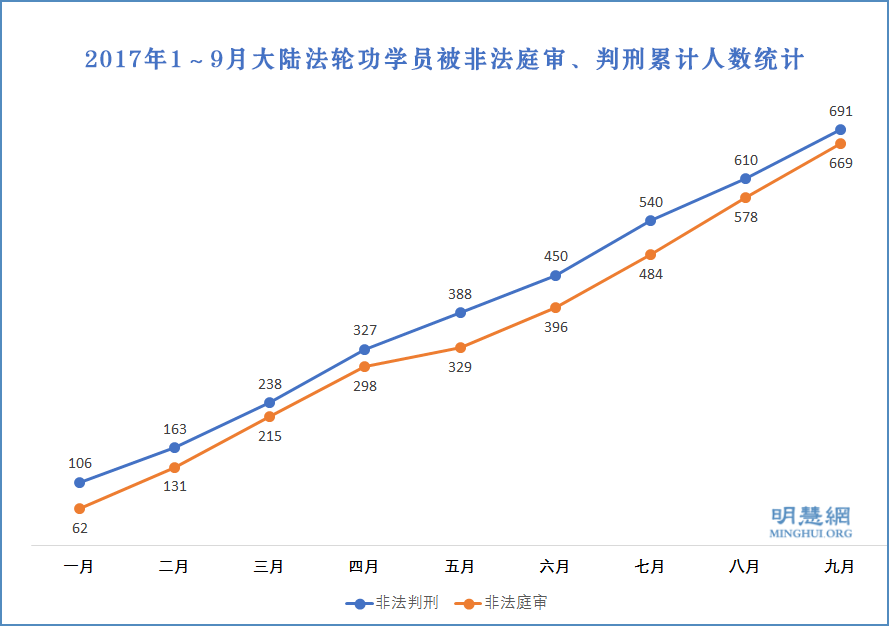 至此,二零一七年一至九月,中国大陆至少691名法轮功学员被非法判刑,669人被开庭迫害。由于中共严密封锁信息,这还是根据明慧网通讯员突破网络封锁报道出的案例统计。