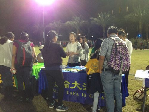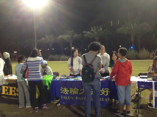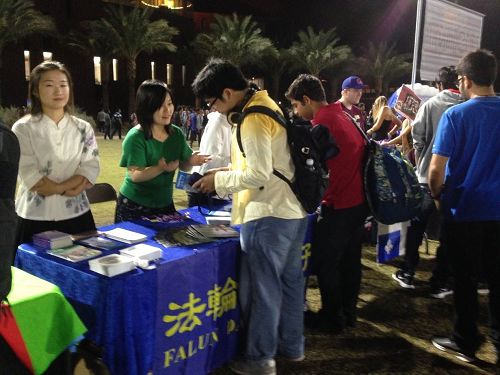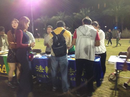 【明慧网二零一七年十一月二十日】二零一七年十一月十七日,美国亚利桑那州立大学(Arizona State University,简称:ASU)举办一年一度的国际生之夜(International Night)活动,ASU法轮大法社团也参加其中,借此向前来参加活动的来自世界各地的学生及访问学者传播法轮大法的美好,同时揭露中共在中国残酷法轮功学员的真相。