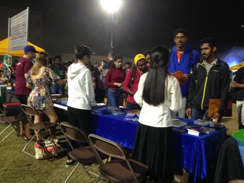 一位之前了解过大法真相的黑人学生来到摊位用中文大声说:“法轮大法神奇!”也有的中国学生虽然不敢走到摊位前,但却在摊位的不远处驻足观看,并用手机拍照。很多肤色不同的学生都把法轮功真相资料带回了家。