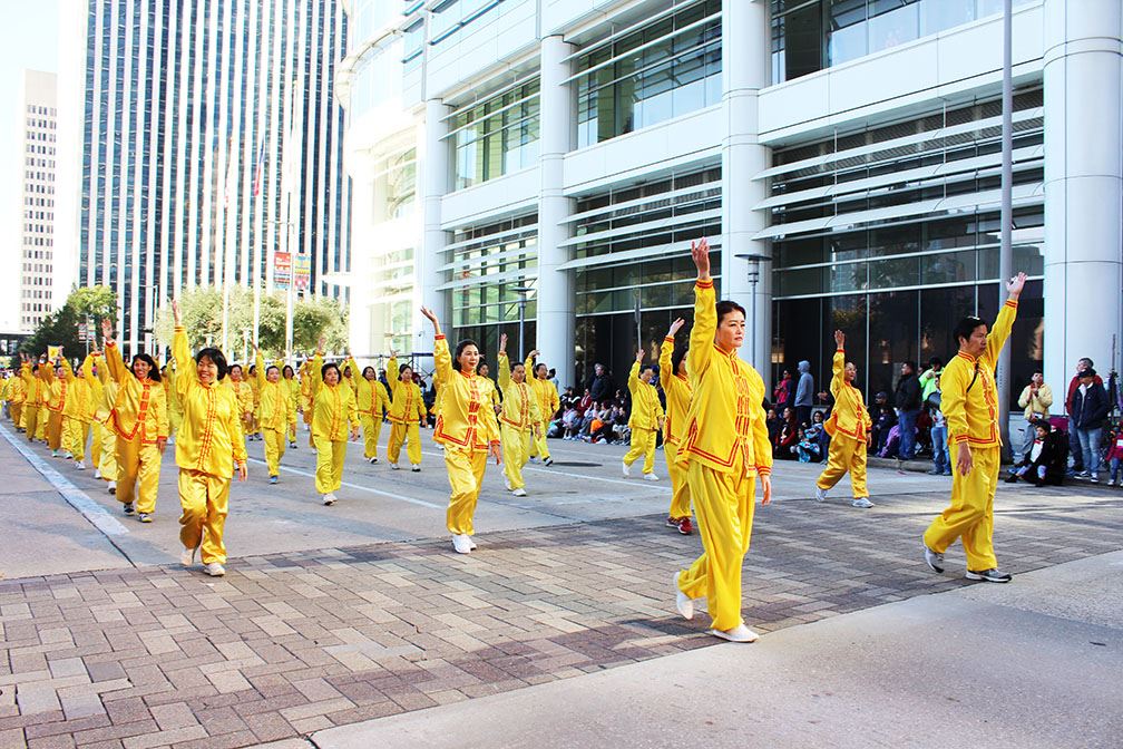 上午约九点,游行正式开始,起点始于史密史街与拉马街(Smith St and Lamar St)的交界处,法轮功学员的队伍被排在第五位。法轮功学员的队伍由炼功队组成,由“Falun Dafa,Truthfulness Compassion Forbearance(法轮大法,真善忍)”横幅引领。学员们身穿金黄色炼功服,队列整齐,色彩亮丽,伴随着祥和的炼功音乐,向两旁观众展示缓慢圆的优美的功法动作。