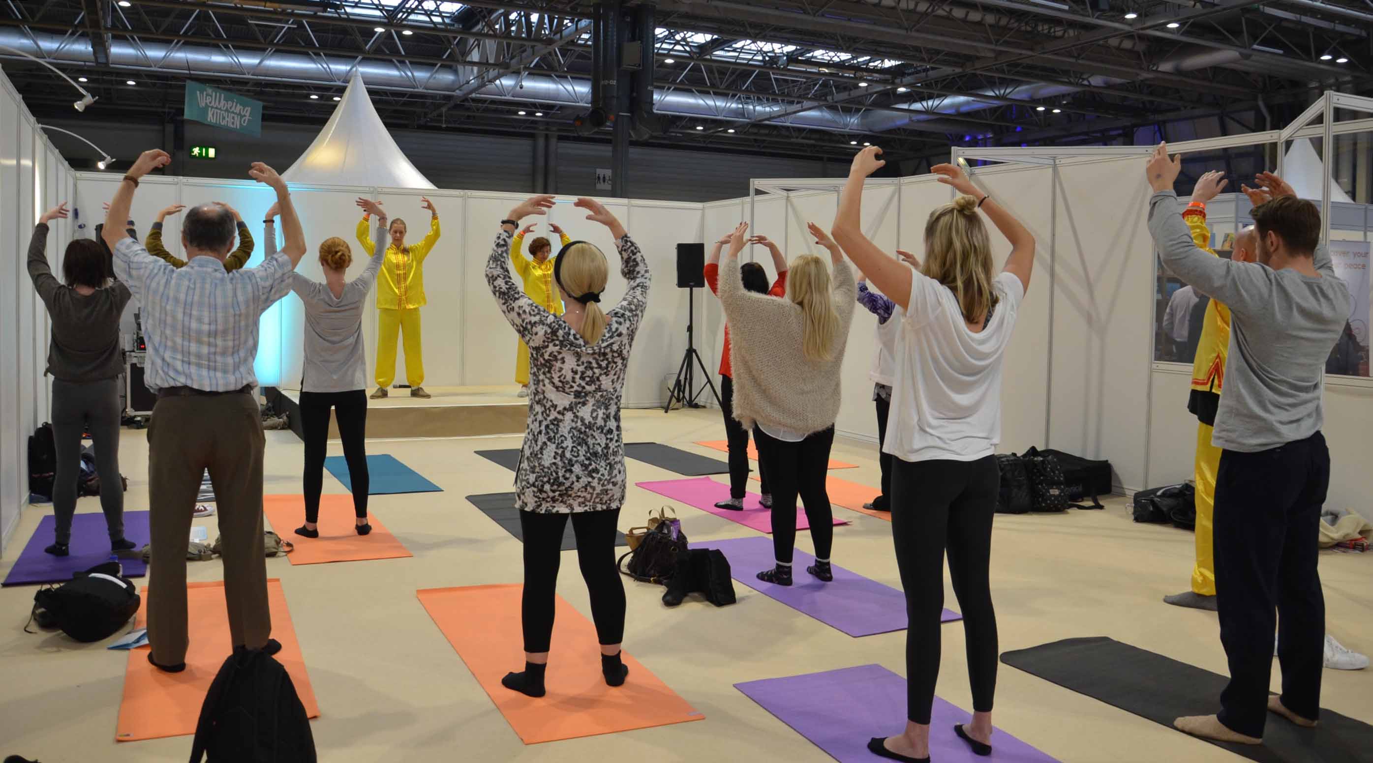 ![]() 图1:法轮功学员在英国伯明翰市举办的“身、心、灵健康节”上设立法轮大法展位,向人们展示功法,分发真相传单。 |