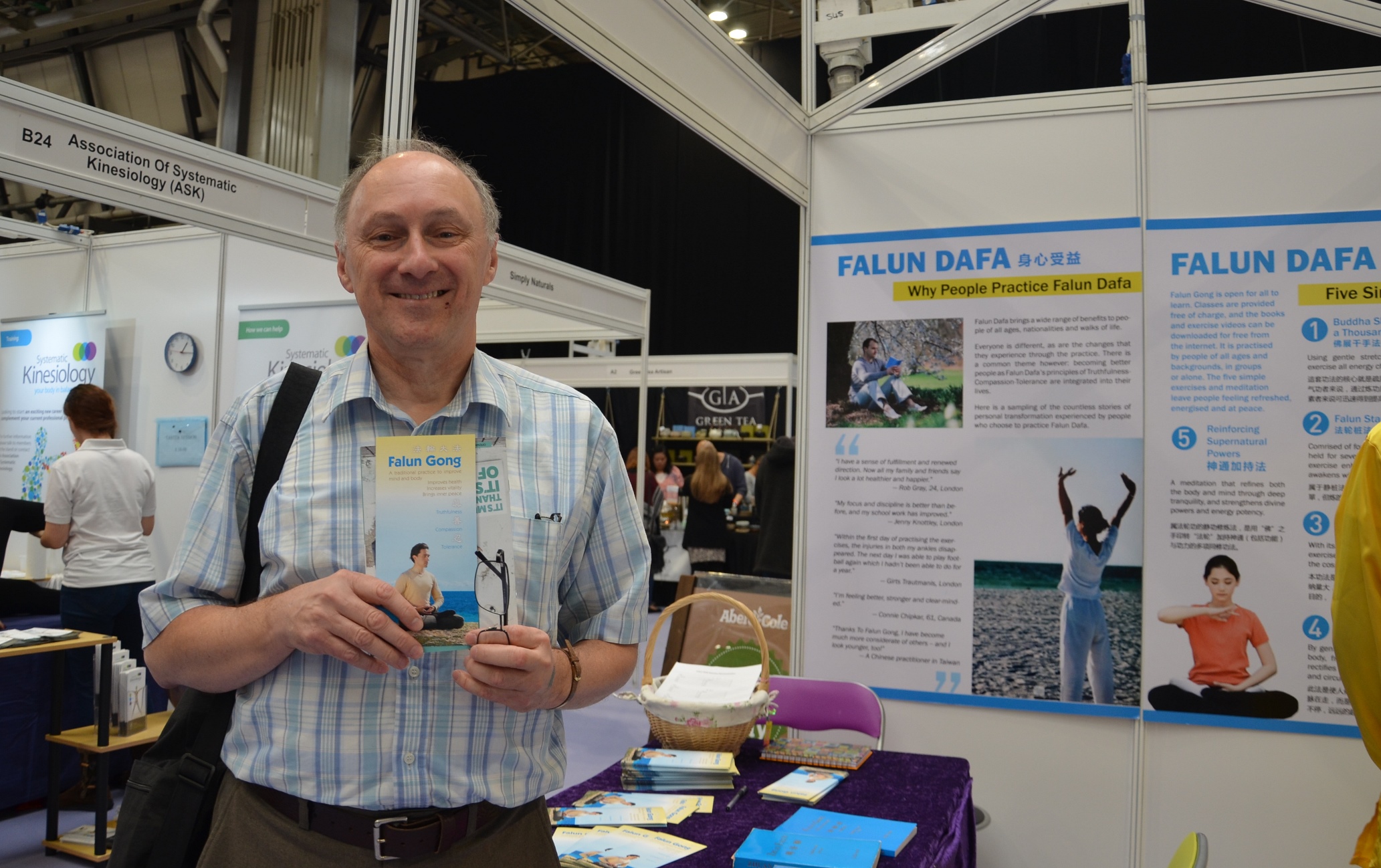 他拿着传单说,“我想学法轮功。剑桥离我家最近,我会给那里的教功班打电话询问。”他还表示,非常高兴看到法轮功学员在这里参加‘身、心、灵健康节’,使他与法轮功再次相遇。
