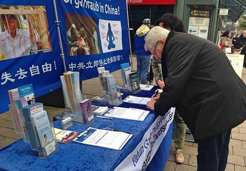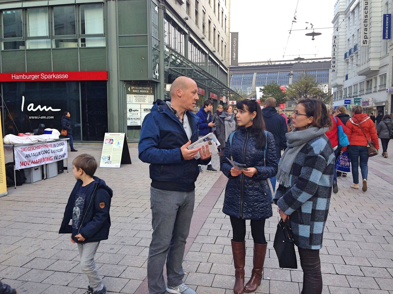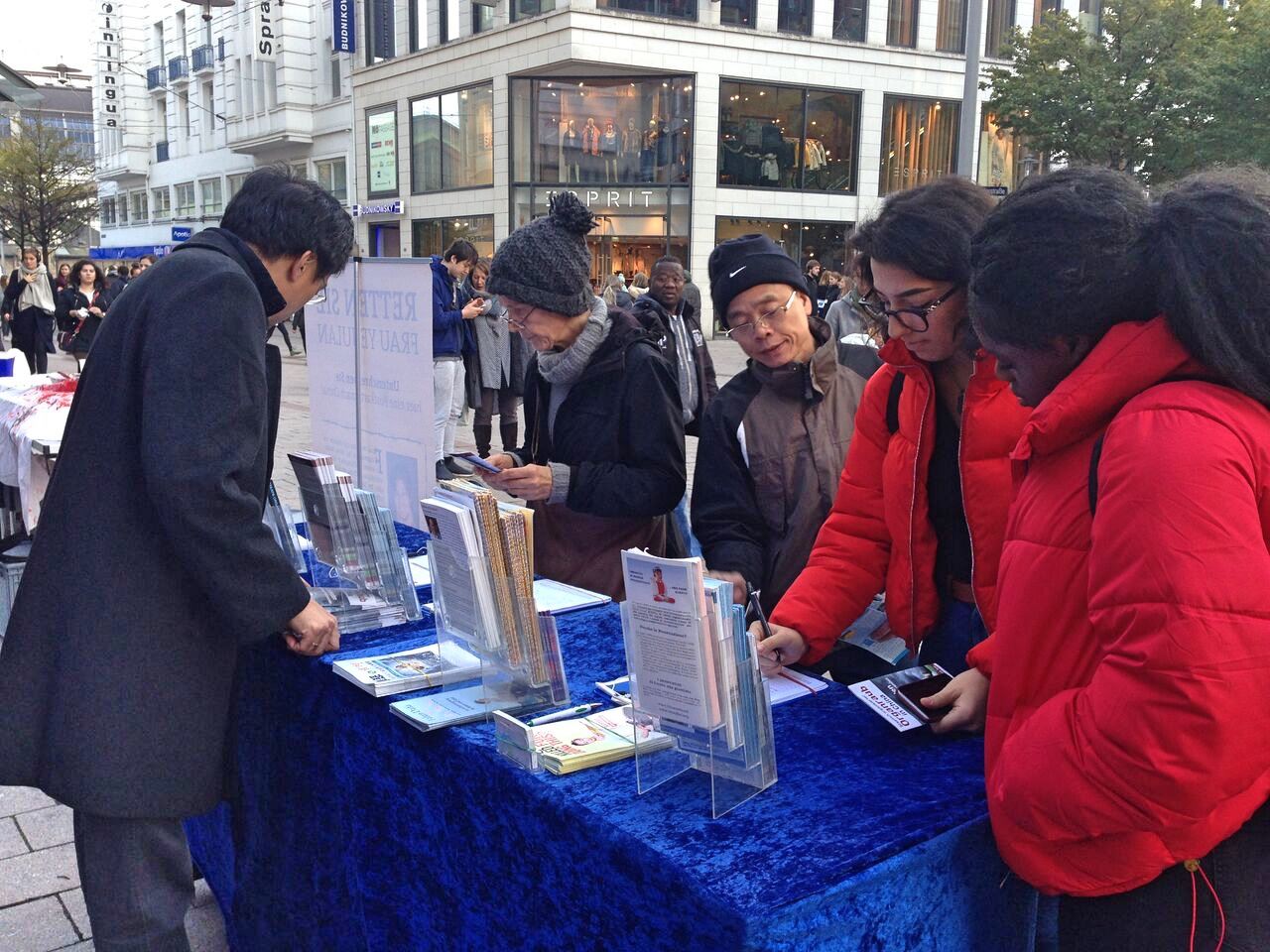 【明慧网二零一七年十一月六日】二零一七年十一月四日,来自汉堡及周边地区的部份法轮功学员在汉堡市中心举办信息日活动。他们展开大型横幅介绍法轮功的真、善、忍理念及五套功法,同时揭露中共有系统活体摘取法轮功学员器官的罪行。许多民众驻足了解真相,并签名反对活摘,制止迫害。