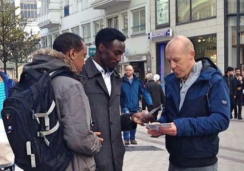 “几年来我一直在注意对法轮功的迫害。对这些人(法轮功学员)所干的事真是太恐怖了。我能做些什么呢?”一位穿着体面的中年男士神情沉重而严肃,向一位女学员问道。当他得知可以用签名的方式帮助抵制迫害时,马上走到展位前签字。边上默默观看静静思索的几位路人随后也跟着在征签表上签了字。