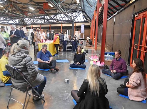 前来博览会参观的莉莉·阿恩德克科(Lily Aendekerk)听法轮功学员韦弗瑞德介绍时,身体感到热乎乎的。她激动地告诉学员,她很相信打坐冥想,她要学习法轮功。