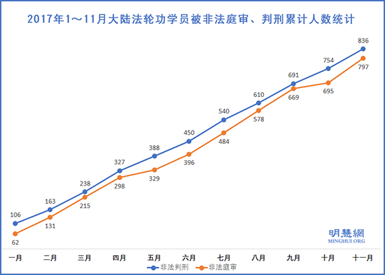 十一月份又有52名法轮功学员被非法判刑,另有30名法轮功学员三月至十月间被非法判刑,十一月份之后才报道出来,共计新增被非法判刑人数为82人。