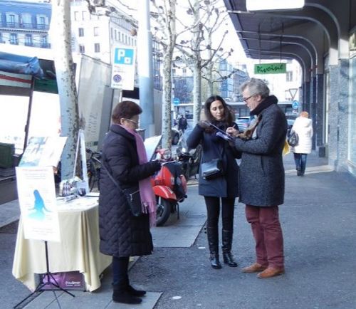 ![]() 图4:法轮功学员向瑞士民众讲真相 |