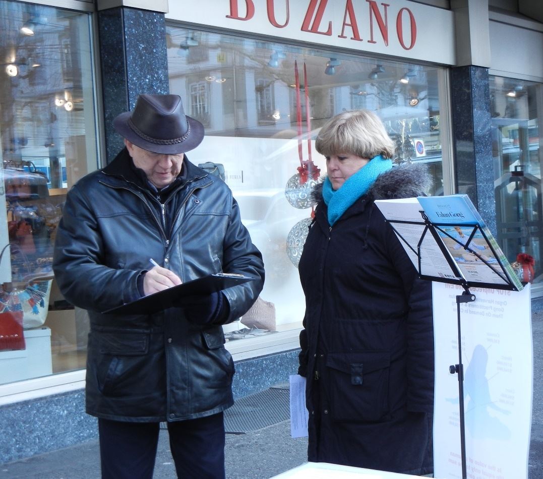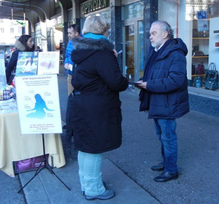 今年九月份,第十四届国际器官捐献大会在瑞士日内瓦国际会议中心举行期间,瑞士法轮功学员曾在会场前举行活动,揭露中共活摘法轮功学员器官的反人类罪行。当地电视台曾经在活动现场进行了采访报道。今天有不少路人表示,他们曾经在瑞士电视节目中知道了相关信息以及当时法轮功学员举行的活动,今天他们直接签名表示支持法轮功学员的反迫害行动。