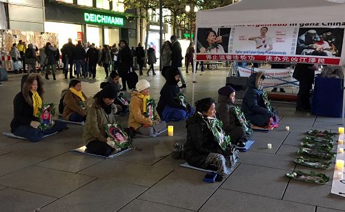 图1-2:二零一七年十二月九日,法兰克福的法轮功学员举办烛光守夜,悼念在中国被中共迫害致死的法轮功学员。