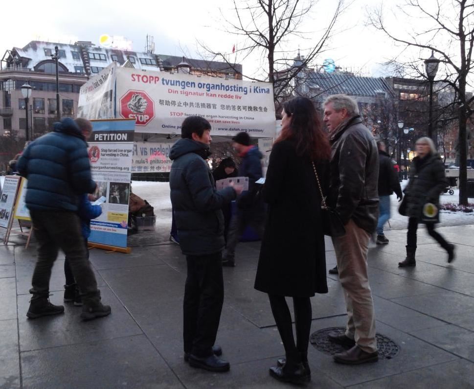 挪威法轮功学员也在这期间继续在首都奥斯陆最热闹繁华的卡尔约翰大街摆设展位。他们不顾冬季的寒冷,满怀热情地向来来往往的行人发放传单,讲述十八年来中共残酷迫害法轮功的事实真相。