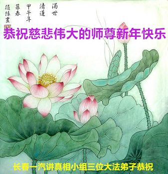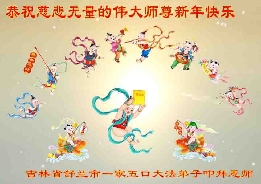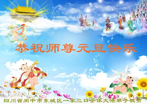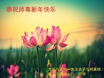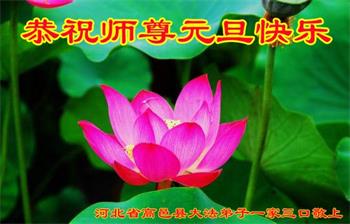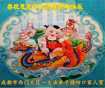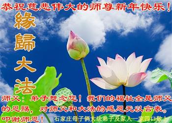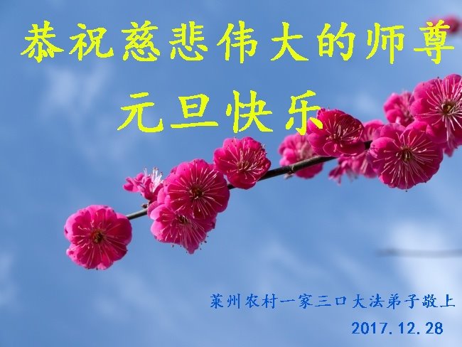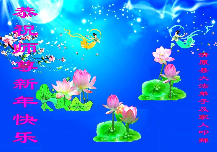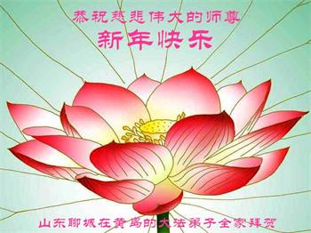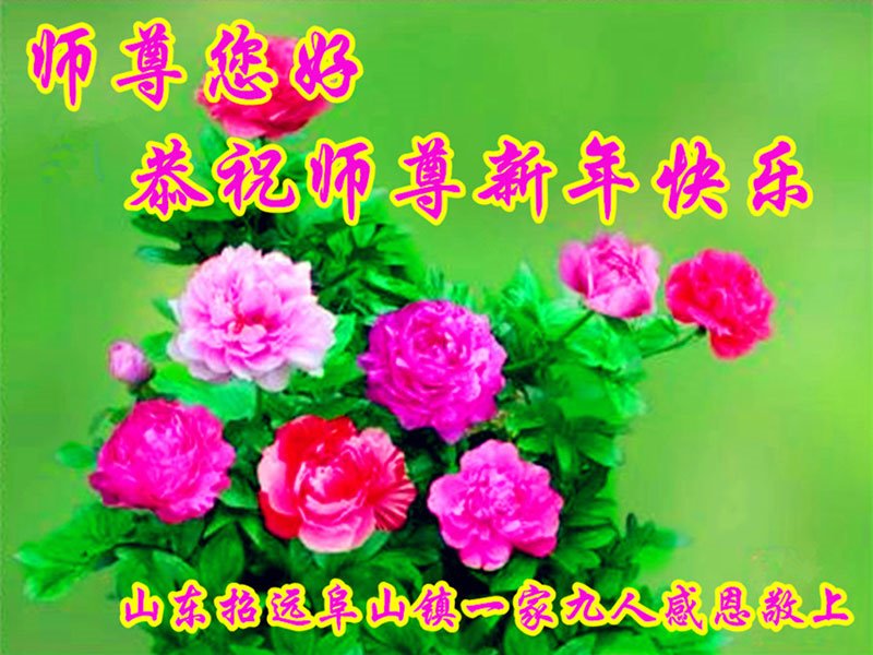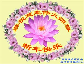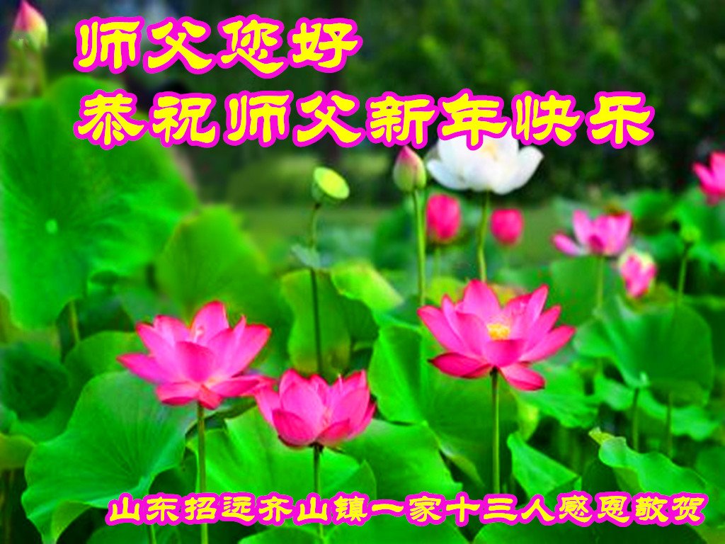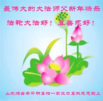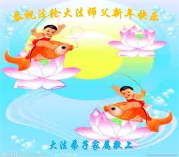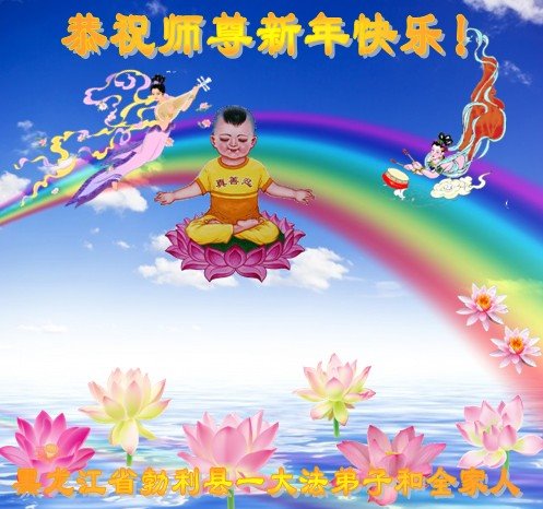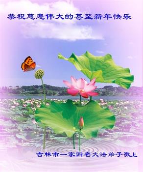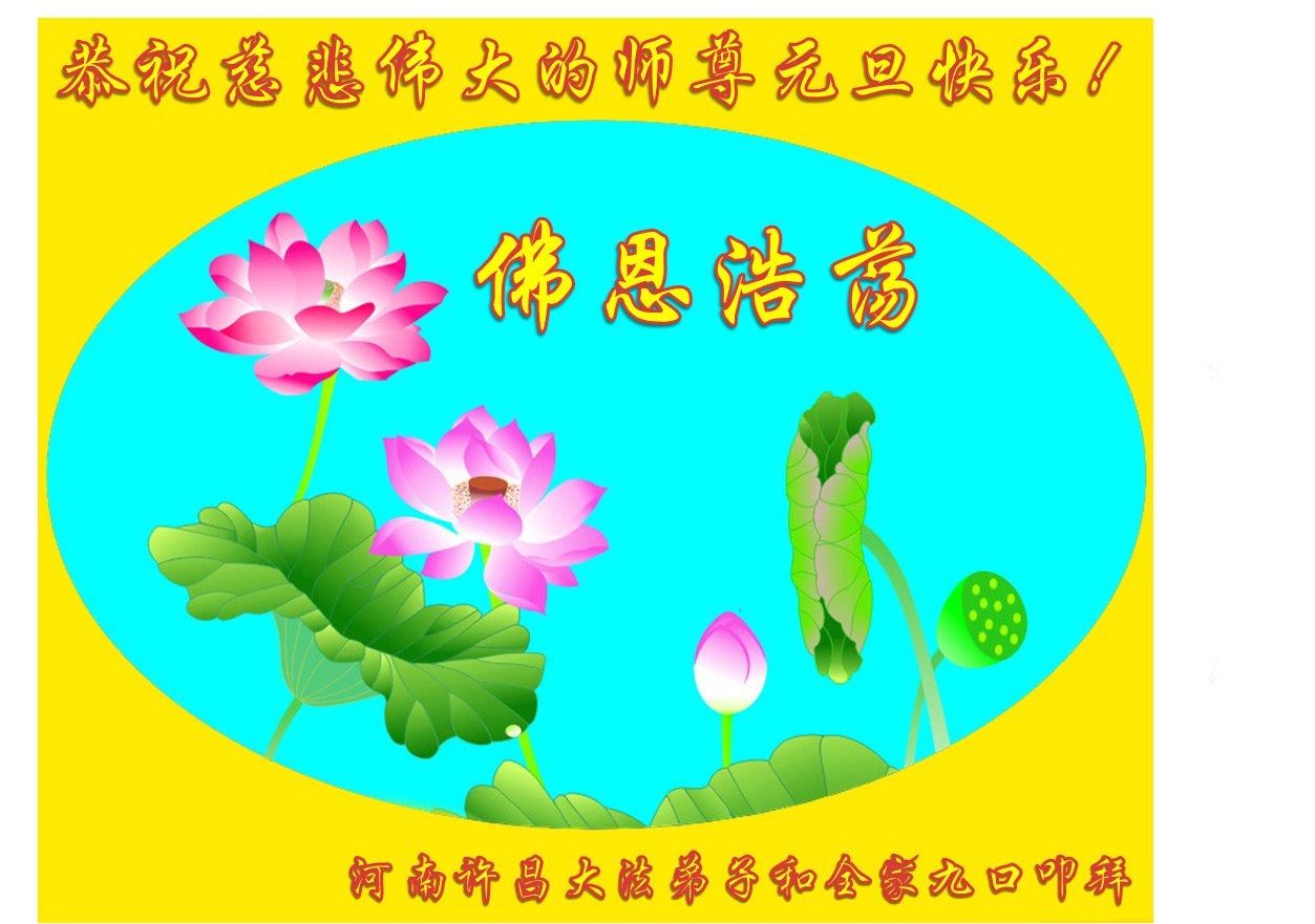 为此在新年到来之际,我们全家七口人心怀无比的恭敬之心,恭祝慈悲伟大的李大师新年快乐!我们会永远记住“法轮大法好,真善忍好”。