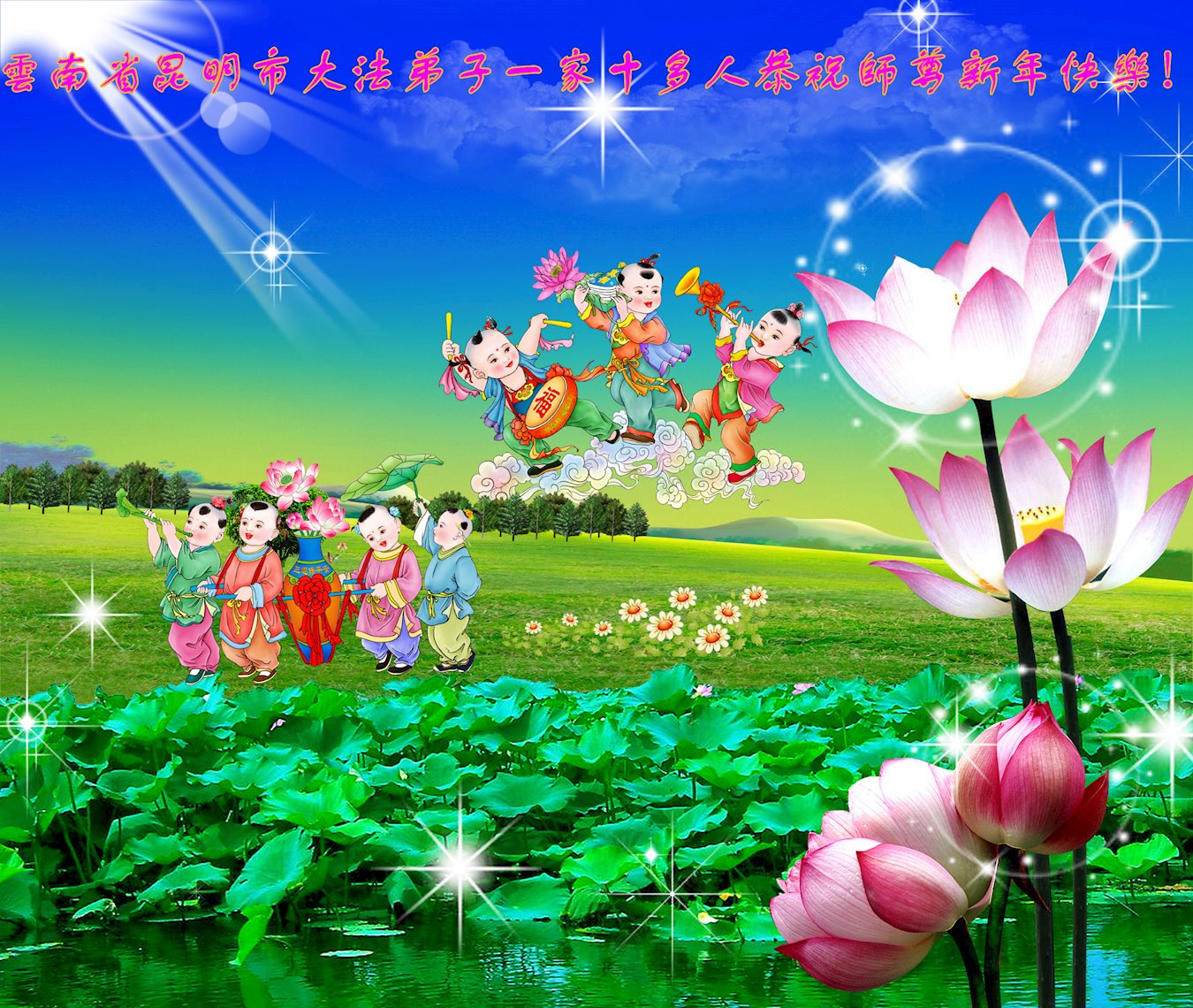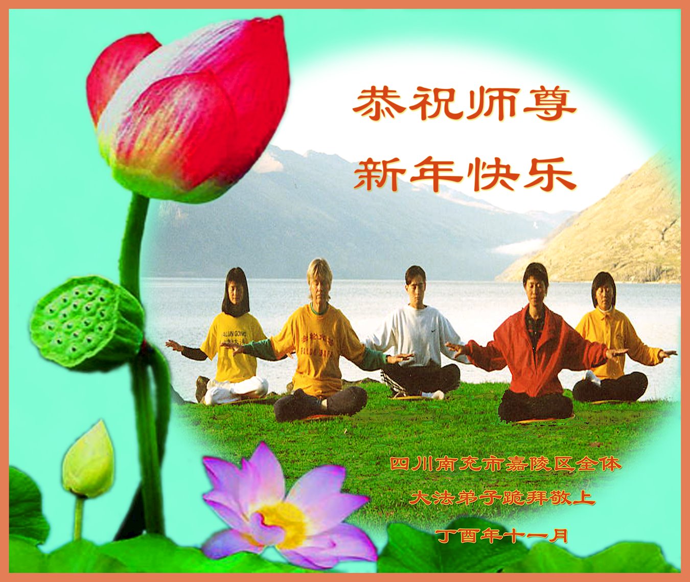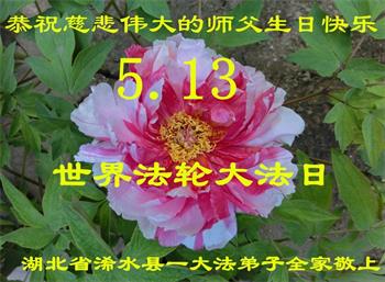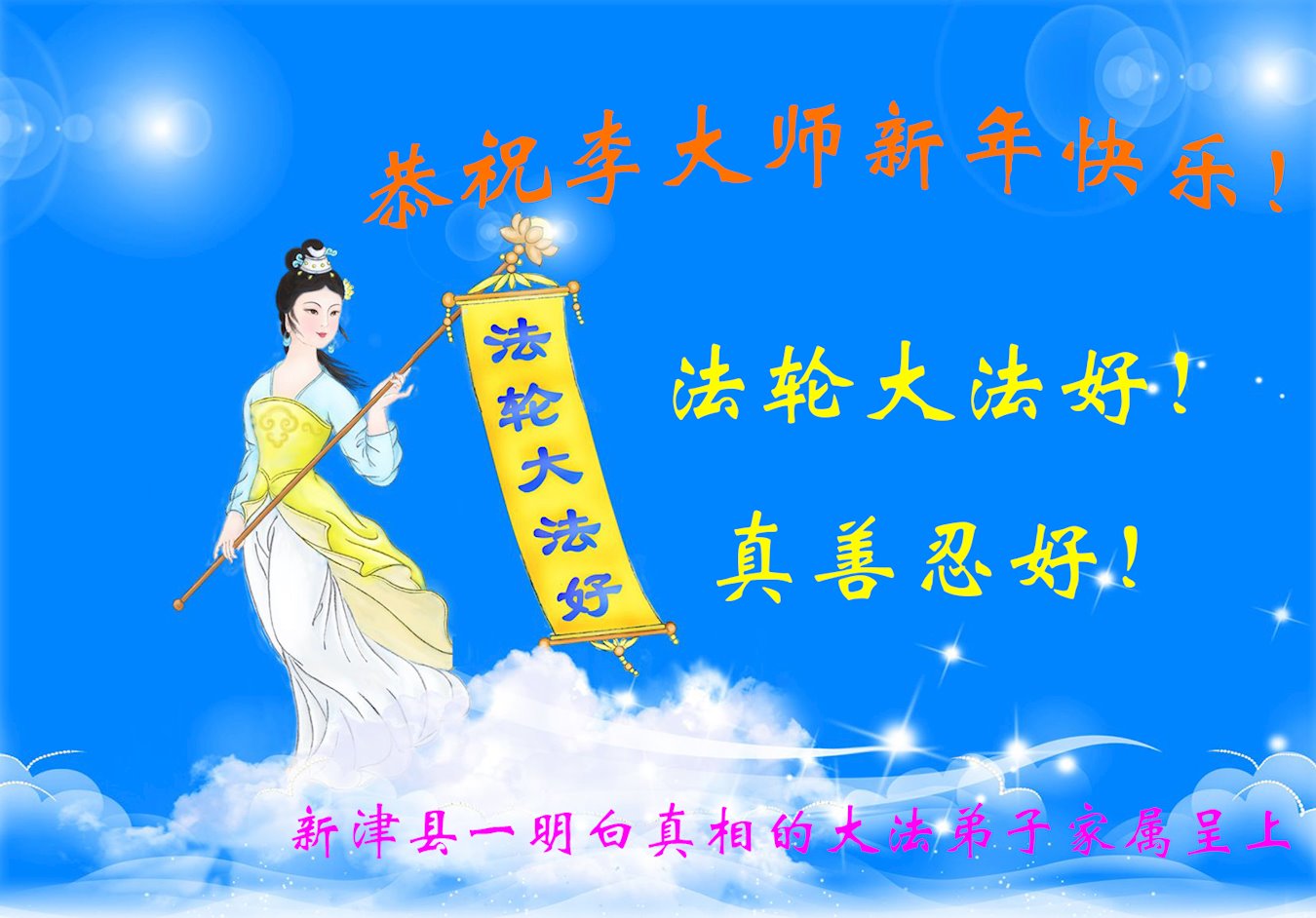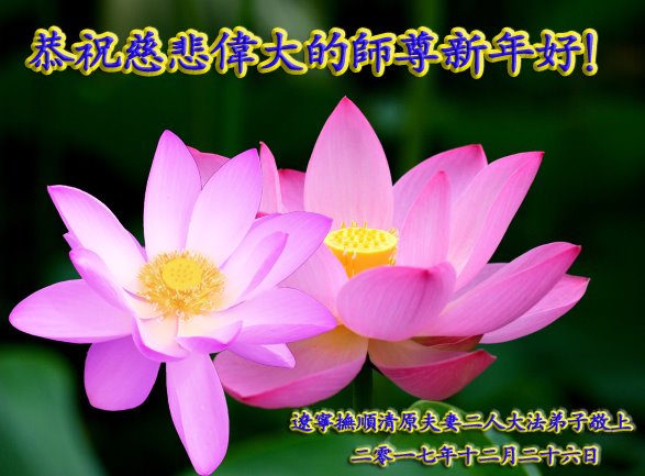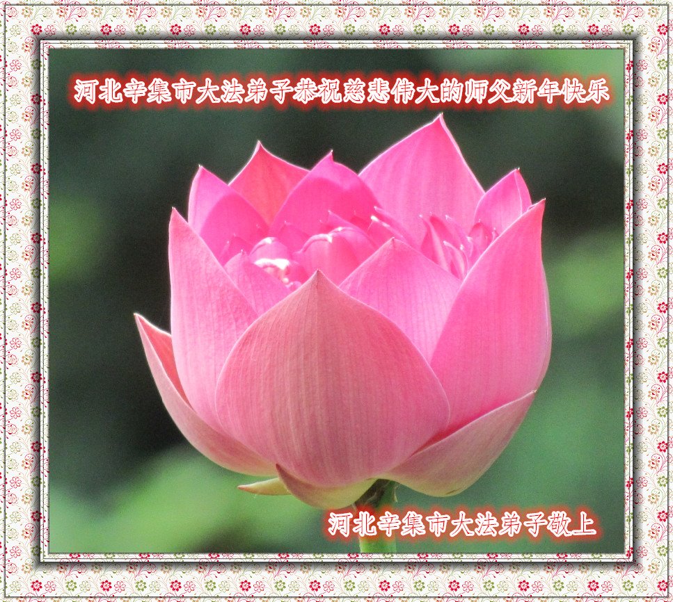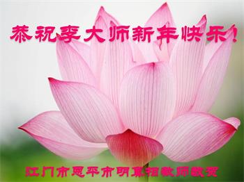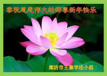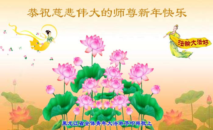 为此在新年到来之际,我们全家七口人心怀无比的恭敬之心,恭祝慈悲伟大的李大师新年快乐!我们会永远记住“法轮大法好,真善忍好”。