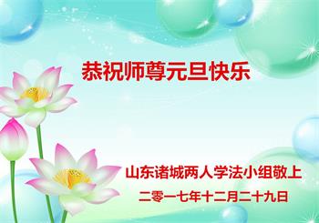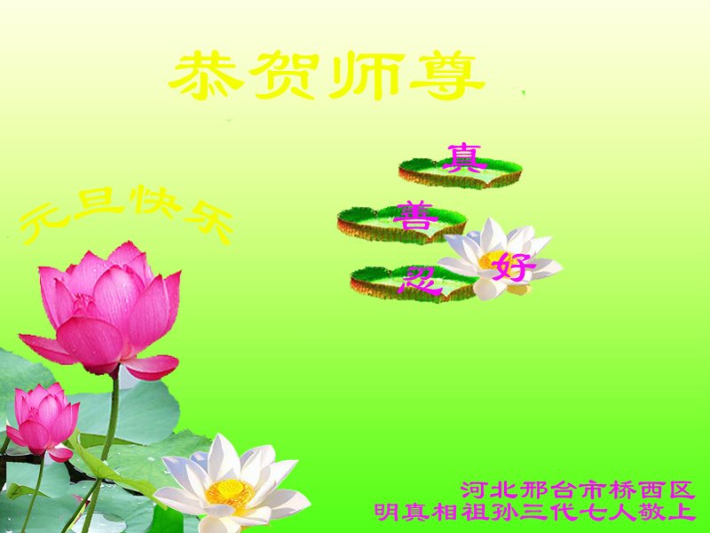 莘县朝城明白真相的大法弟子家人祝李洪志大师元旦快乐!“法轮大法好”、“真善忍好”九个字使我们全家受益。法轮大法佛光普照,真、善、忍牢记心中指导我们做好人,大法小册子让我们知道如何孝敬父母如何帮助他人,神韵晚会让我们感受到真正的中国神传文化是如此的震撼!
