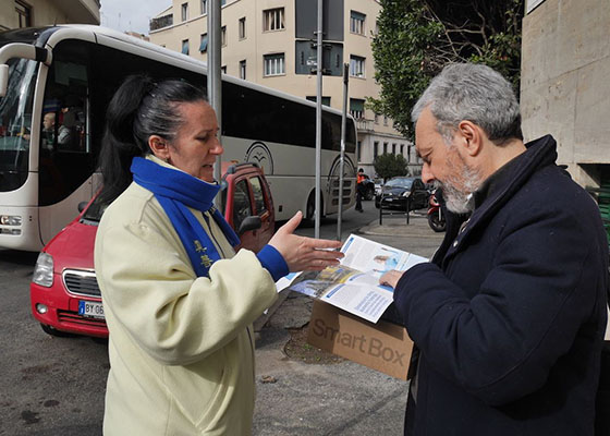二月八日,意大利罗马中共使馆前,法轮功学员揭露中共活摘法轮功学员器官的罪恶,民众支持法轮功学员反迫害。
