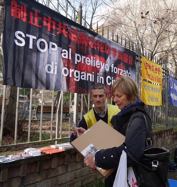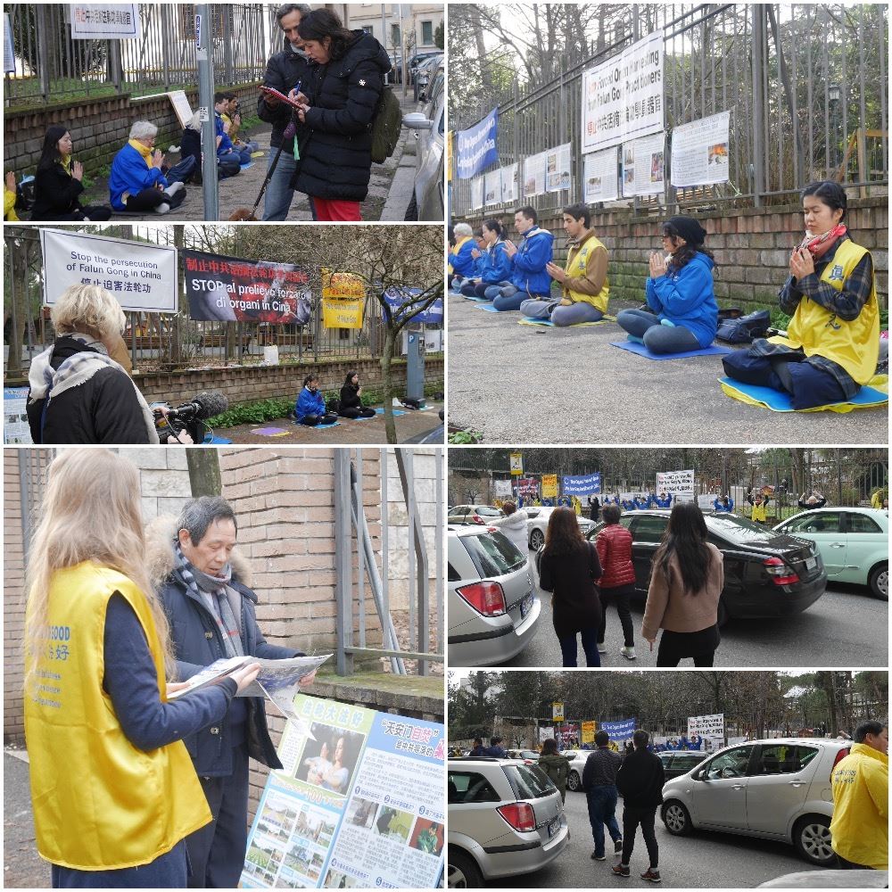 【明慧网二零一七年二月十一日】(明慧记者容法报道)二零一七年二月八日,意大利罗马中共使馆前,法轮功学员揭露中共活摘法轮功学员器官的罪恶,民众支持法轮功学员反迫害