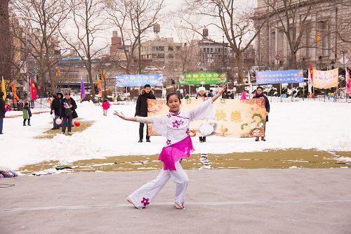 【明慧网二零一七年二月十三日】二零一七年二月十一日是元宵节,是华人的重要传统节日。这天的纽约雪后天晴,法轮功学员再次来到华埠罗斯福公园为当地民众送福,精心准备了舞龙、舞狮、腰鼓、乐器、歌唱等表演,还有法轮功的功法演示。纽约华埠市议员陈倩雯女士为此活动发贺信,赞扬法轮功学员为华埠带来美好的节日活动。