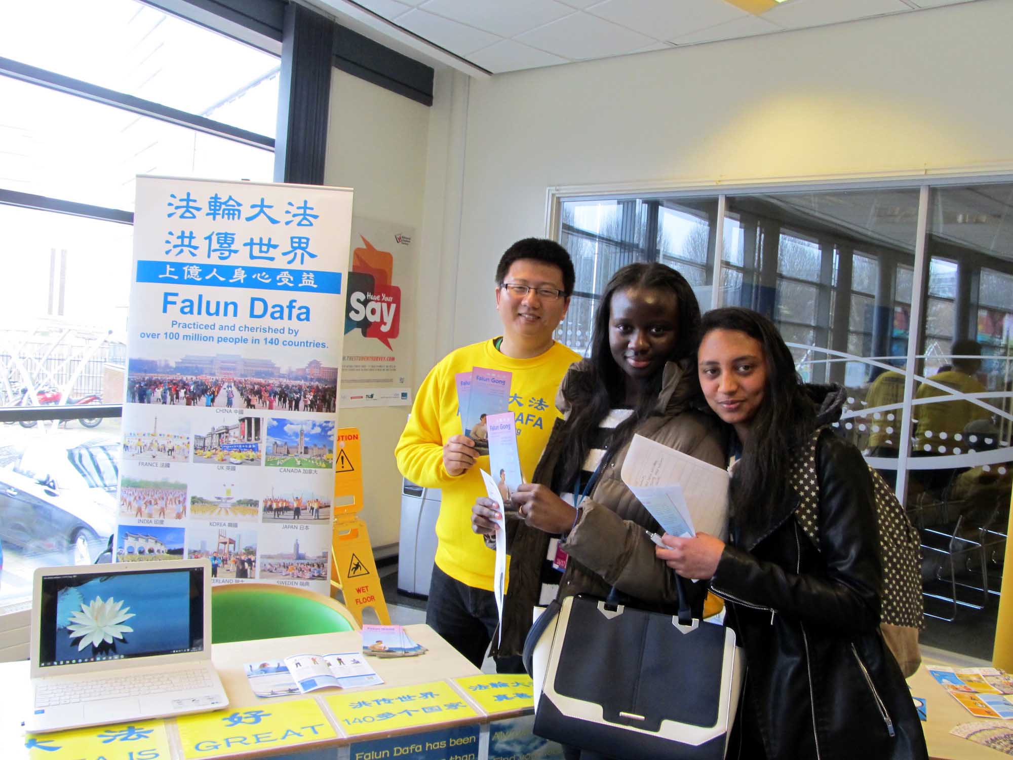 二零一七年二月十三日至十七日,是这所学校一年一度的多元文化周,法轮功学员应邀在该校位于伯明翰市中心的Matthew Boulton校区设置展位,参加了今年的活动。这是法轮功学员第一次来到这所学校,在活动大厅的众多展位中,法轮功的展位显得非常亮堂,引人注目。