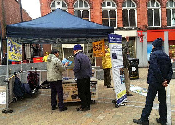 英格兰法轮功学员在利兹市中心传播法轮功的真相。不少行人驻足观看展板,有大陆游客了解中共活摘器官的罪恶后也签名支持反迫害。