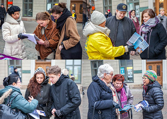 法轮功学员们在斯德哥尔摩最热闹的皇宫旁的钱币广场上,竖起“法轮大法好”的横幅,展示法轮功的功法,同时向过往的行人派发传单。
