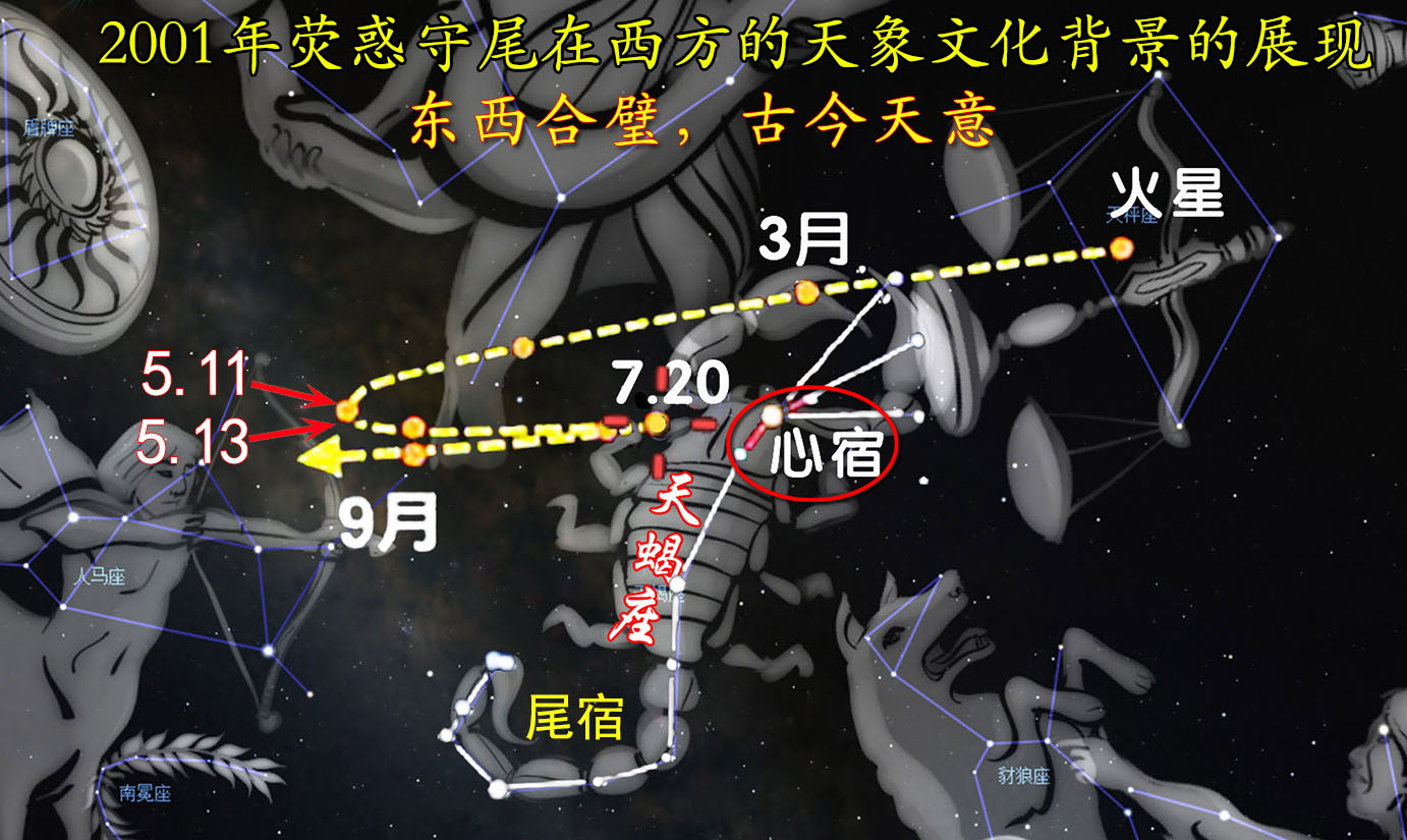 ![]() 图:2001年火星轨迹“荧惑守尾”在西方天象文化背景的展现 |