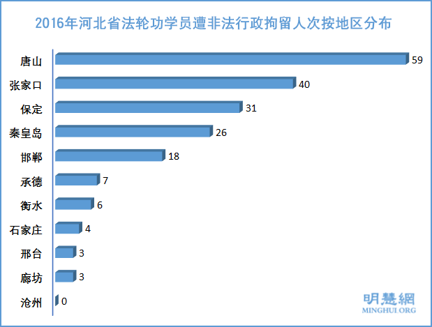 2016年,中共河北当局对法轮功学员迫害中,1226人次遭受各类迫害,迫害最严重的是唐山212人次,其次是保定173人次,秦皇岛169人次,张家口166人次,邯郸139人次,石家庄85人次等等。其它见图2、表1。
