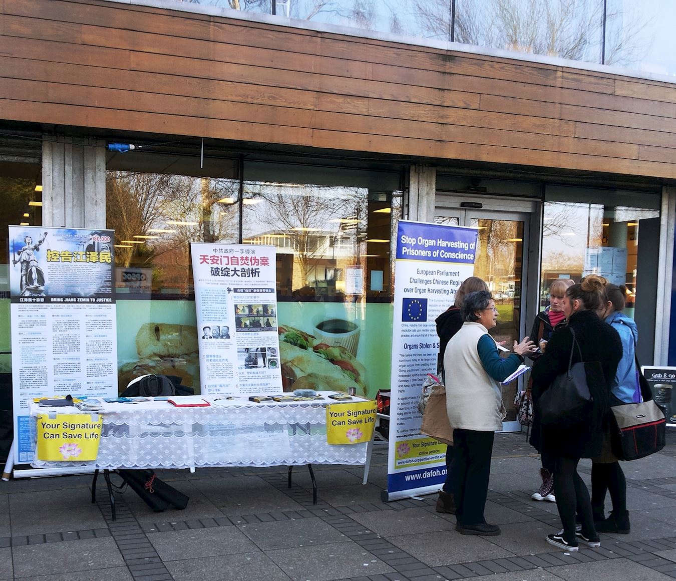 真相桌设在学生会楼(Union Building)前,许多师生在课余时到这栋楼休息。一些学生经过时拿了传单,阅读之后又回到真相桌,在制止迫害征签表上签名。一些学生看了真相传单后,又传给同班的同学看。几位医学学生在真相桌前停下脚步,阅读海报上二零一六年七月欧洲议会通过的《制止中共活摘器官的48号书面声明》介绍后说:“(中共)太可怕了!我们要签名!”