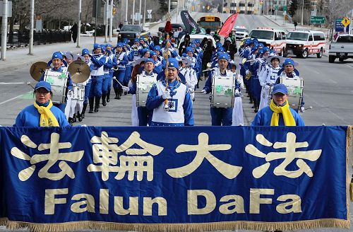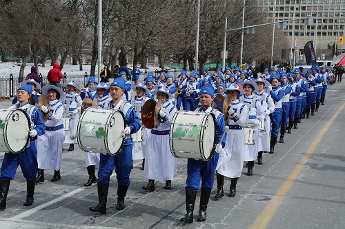 在“史上最冷的圣派翠克游行日”中,五十多个来自蒙特利尔和渥太华的天国乐团的乐手们,各个精神饱满、神采奕奕。天国乐团一共演奏了六首乐曲《法轮大法好》、《法鼓法号》、《神圣的歌》、《法正乾坤》、《送宝》、《凯旋》。一些法轮功学员在游行队伍两侧的人行道上发传单,介绍天国乐团,向社区传递法轮大法的美好。