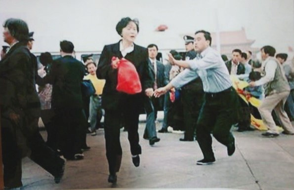 ![]() 陈春美女士二零零零年九日三十日在天安门广场高喊“法轮大法好!”被四个便衣警察追击的现场照片 |