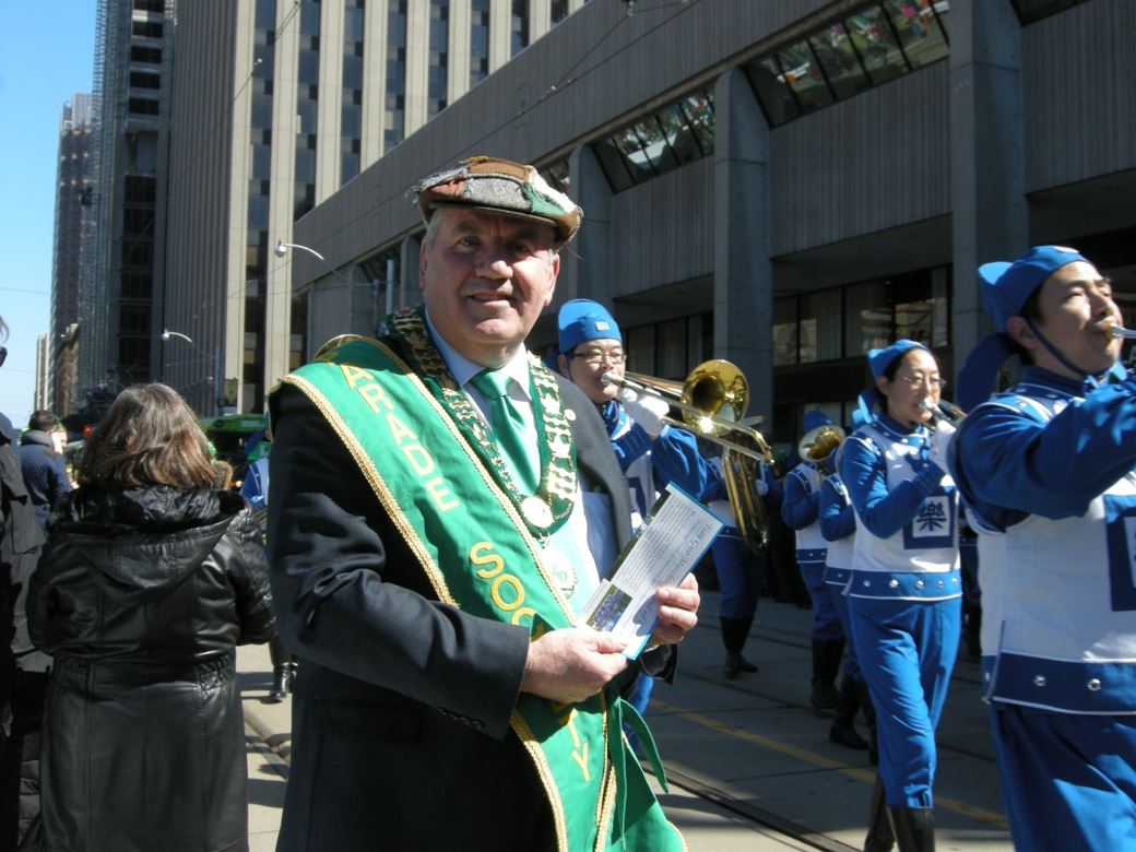 圣派翠克节大游行的主席Shaun Ruddy先生看到法轮大法代表队路过主席台时,也高兴地站到队伍旁边跟法轮功学员合影。