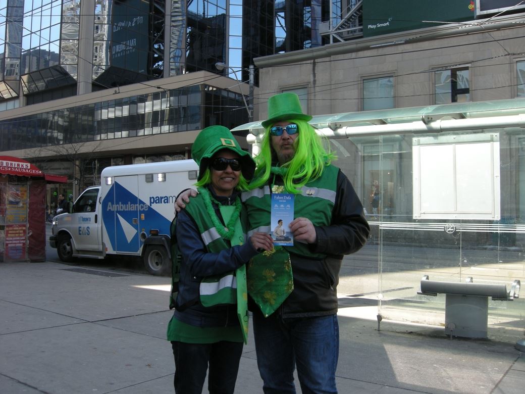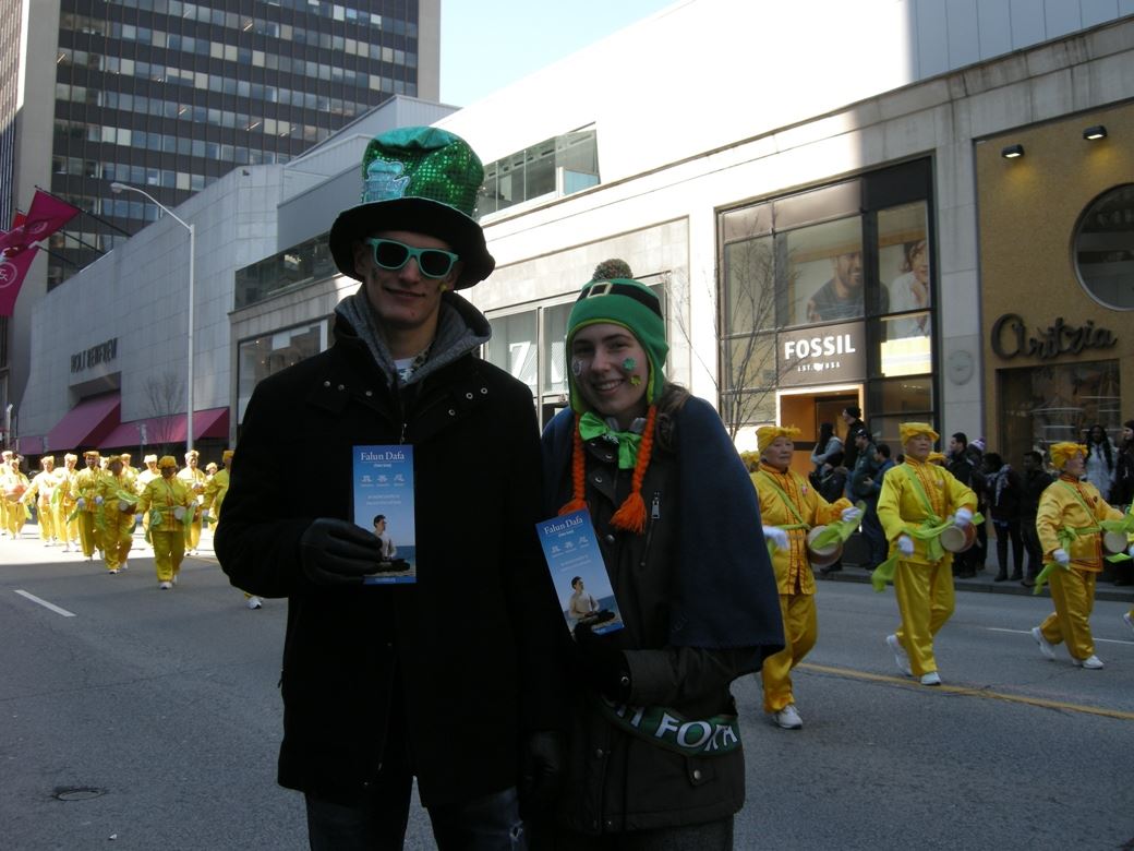 Kathleen Drummondhay女士和Enzo Caluori先生是大游行现场执勤警官。Drummondhay警官说:“天国乐团和腰鼓队太美了,他们的服装颜色多姿多彩,我爱他们!”当看到大法真相传单中的对法轮功的介绍后,Drummondhay警官对法轮功很感兴趣,问法轮功学员:“我要想学的话,找谁联系呢?”法轮功学员就指给了Drummondhay警官传单上的法轮大法各地联系人和联系方式。Caluori警官对法轮大法代表队也是赞不绝口,并祝法轮功学员圣派翠克节日快乐。