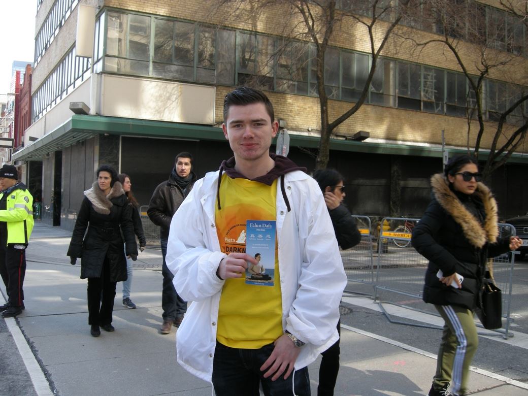 Ken Dishman先生是加拿大广播电视台CTV的摄影师,今天在现场录制节目。Dishman先生说:“法轮大法代表队演奏的音乐曲调和谐一致,非常好听,我觉得非常享受。” 由于还要忙着录制节目,拿到法轮大法真相传单后,Dishman先生说他回去后会好好看一看传单内容。