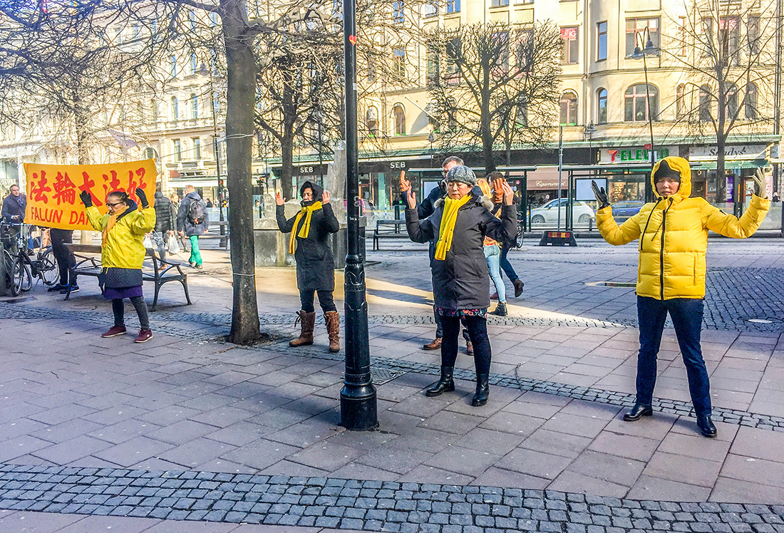 “好美啊!”这是两位穿着入时的瑞典女士,经过活动场地时发出赞叹,并用手机拍照。原来其中的一位女士以前接触过法轮功,也了解了真相,还学了炼功动作,只是工作一忙就放下了。今天经过这里,看到法轮功学员炼功的场面似乎又唤起了她美好的记忆。接过法轮大法简介的传单时她连声道谢。学员给她讲大法遭到中共的无理迫害时,她指着大法传单说:“我非常清楚,就是这三个字(真善忍) ,中共不喜欢,不可容忍,因为它(中共) 是暴政,是邪恶的。”随后,两位女士走到呼吁制止迫害的征签簿前签下了自己的名字。