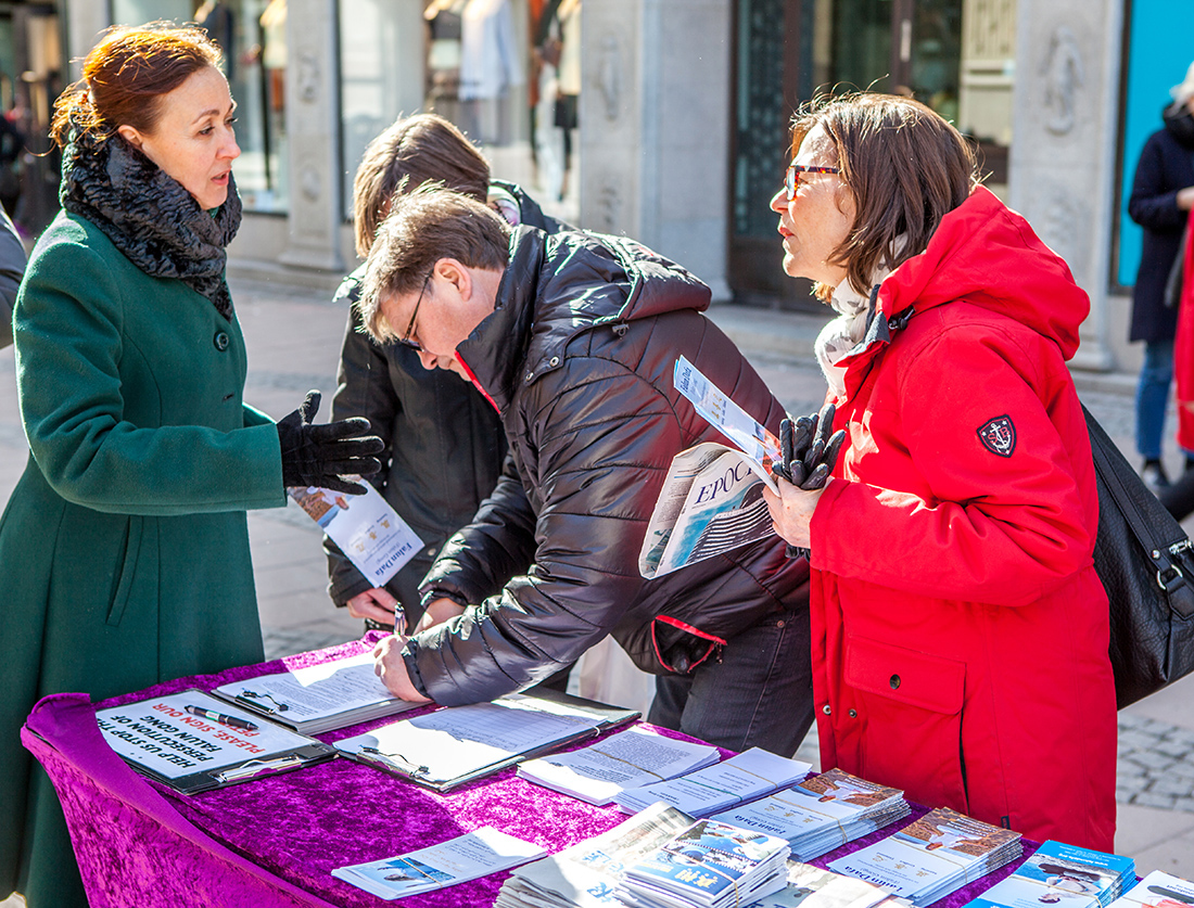 【明慧网二零一七年三月二十七日】Stureplan是斯德哥尔摩著名的金融、美食、精品购物中心,坐落在繁华的市中心地带,在这里可以找到所有世界著名的品牌,是人们休闲购物的主要去处,也是当地的富人居住区。二零一七年进入三月份,瑞典法轮功学员每周两天——周一和周五,来到Stureplan这个著名的精品购物街旁举办法轮大法信息日活动。