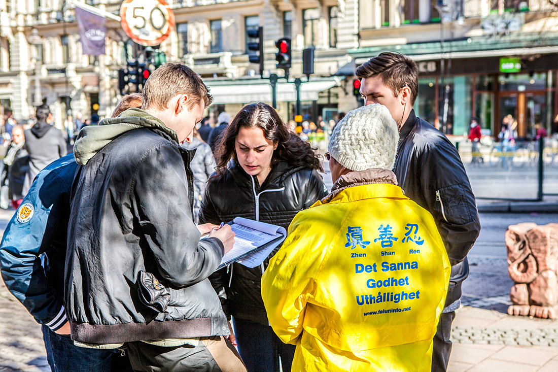 倜穆 (TIM )是一位在瑞典长大的华裔年轻人,是当地一家金融公司高管。很早他就了解了法轮功真相并认同大法、支持法轮功学员反迫害。再次邂逅法轮功学员,他很高兴,主动过来签名支持反迫害,并告诉学员:“这个地段是白领阶层聚集的地方,工作节奏快,有的人可能只是一走一过拿了法轮功的真相传单就走了。但等他们休闲的时候,会坐下来聚在一起探讨各自感兴趣的话题。这些人的交际面很广,都有自己的思想和见解,大家会来关注这件事(活摘器官)的。”